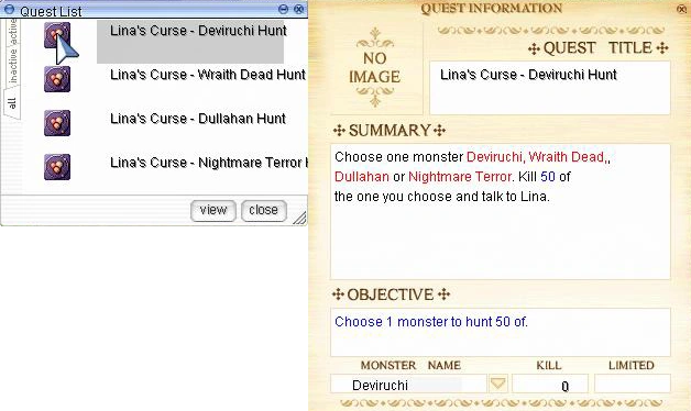 When RO first launched in 2002, the game had quests but absolutely no way to track them. An attempt at a quest log was implemented years later, which consisted of two parts: the quest log window and the quest information window. The quest information window was designed much differently from the quest log and looked out of place from the overall design of the game's UI.